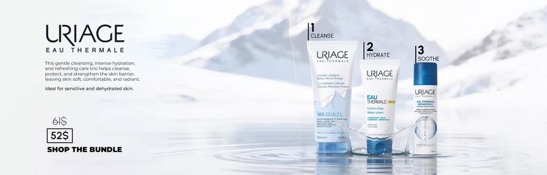 Three Uriage skincare products on a white background